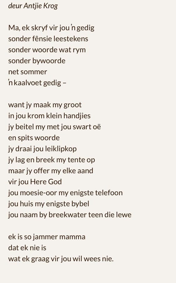 Antjie is sekerlik ons hofdigter as daar nog so iets sou bestaan. Sy reken sy kon op 18 ophou skryf het, want "Ma" is haar bekendste gedig. Die gedig wat oral aangehaal word en wat haar ma een moerse belediging genoem het. En al glo sy sy gaan nooit weer skryf nie, is ons so ryk aan haar woorde, deur dekades.