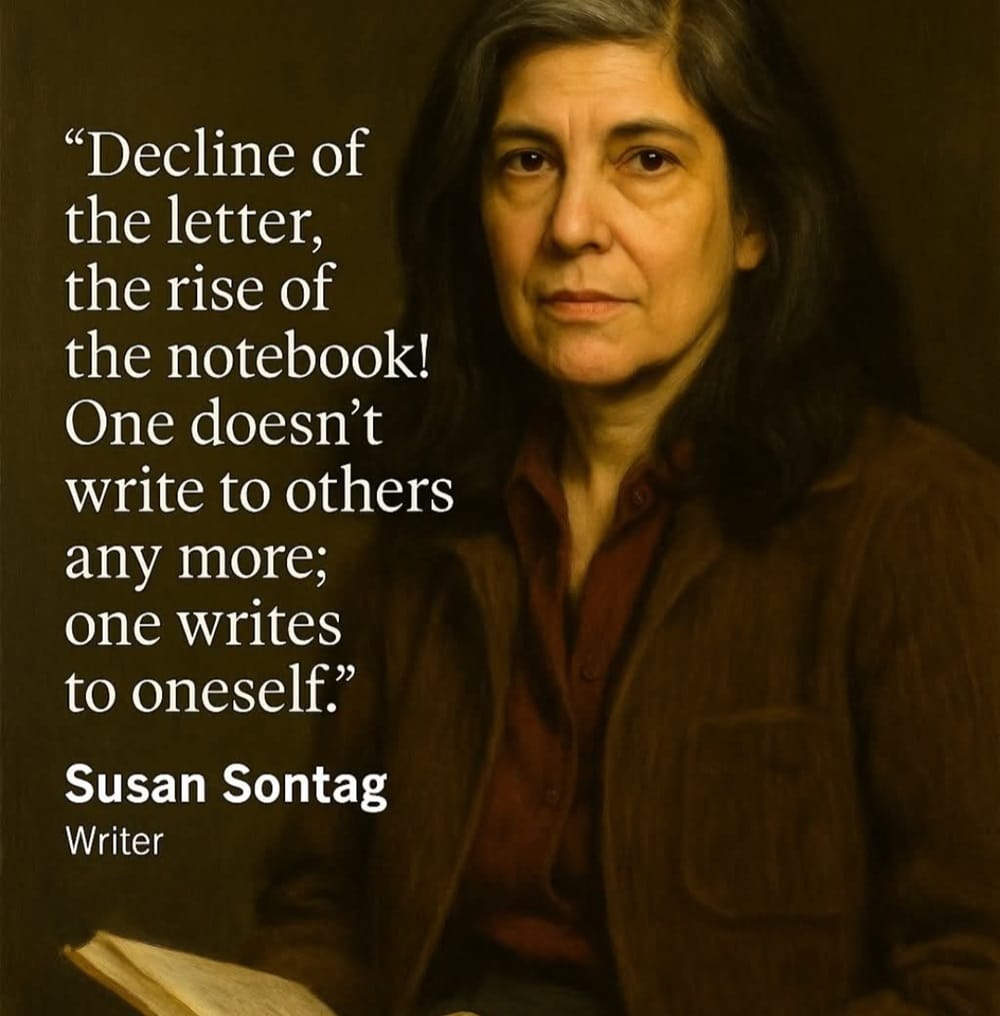 Liewe Susan Sontag, ek skryf graag briewe, meer en meer. En as julle vername joernaalhouers wil eerlik wees, sou julle erken julle skryf in elk geval vir 'n gehoor, vir die vergetelheid, vir latere publikasie, vir ander se oë.