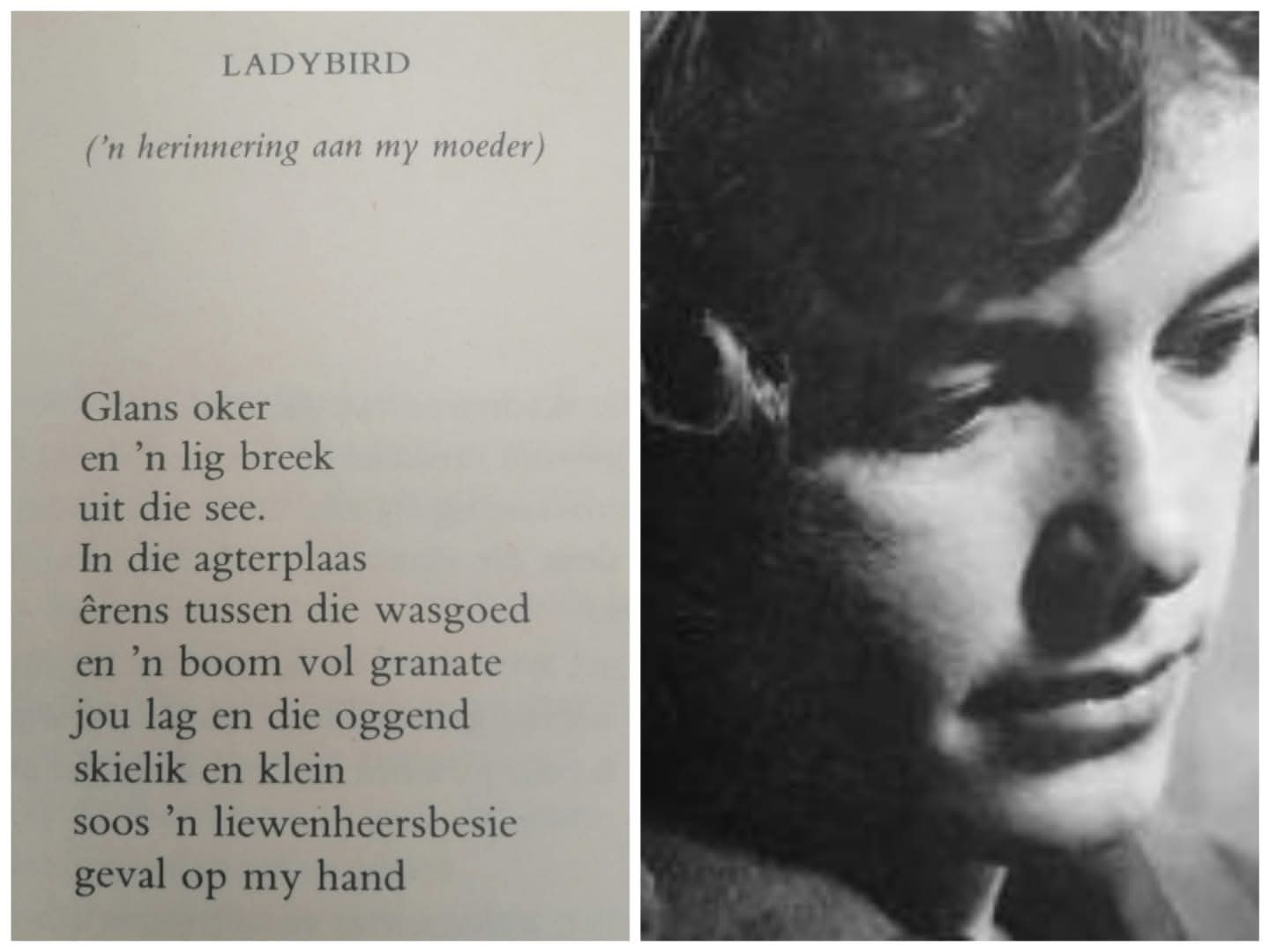 Daar is net een babafoto van my ma. Dis effens uit fokus. Sy is besig om te huil of het sopas gehuil. Haar gesig is vertrek in ontsteltenis. Gerf donker hare, bleek gesiggie. "Dingetjie" het hulle haar genoem.