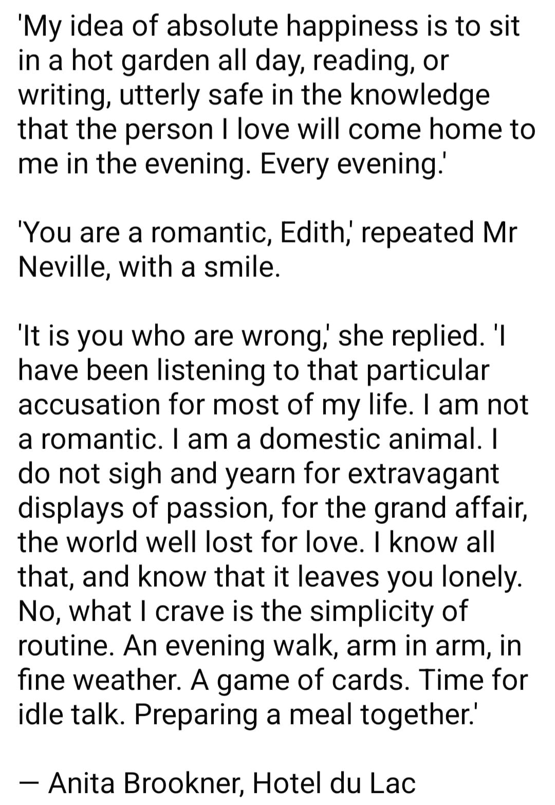 Ek glo nie die twee sluit mekaar uit nie. Beleefdheid en bedagsaamheid is hoogs romanties, as jy my vra. Ek was al aan die ontvangkant van Edith se extravagant displays of passion, van buffels van beide geslagte wat my hartstogtelik verinneweer en konstant onseker gelaat het - verkleineer en angstig. Is dít romanties?